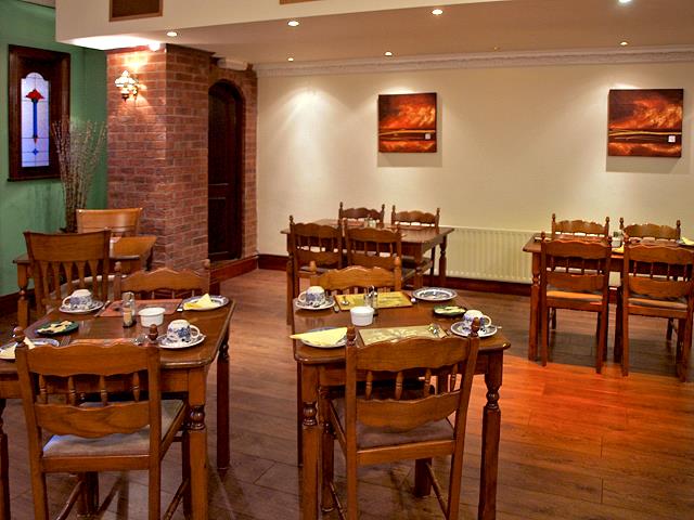 Wir servieren ein kontinentales Frühstücksbuffet mit frischem Obst, Joghurt, Müsli, Fruchtsäften, hausgemachten Scones, Gebäck und hausgemachtem Schwarzbrot; eine Auswahl an Aufschnitt, Käse, Tomaten und gekochten Eiern. Tee, Kaffee und Toast werden an den Tischen serviert.